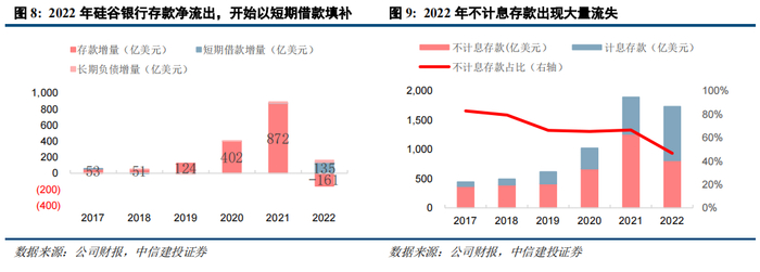 负债端,客户结构过度聚焦于初创企业,行业过于单一。2022年开始,美联储持续加息,市场资金成本提高,初创企业融资困难,只能优先使用自身的活期存款,现金消耗速度加快,叠加利率上行情况下硅谷银行低息存款吸引力降低,负债端出现了持续的存款流失。2022年硅谷银行存款规模1731亿美元,较2020年净流出161亿美元,其中不计息存款流出高达450.98亿元,不计息存款占比由2021年的67%下降至47%,为了弥补这部分存款流失,硅谷银行被迫选择增加了短期同业借款135亿元以维持自身长期性资产,在利率持续上行的过程中,这部分高成本的同业借款使硅谷银行的负债结构雪上加霜,借入高成本的短期资金的“借短养长”做法在降息的过程中可行,但在目前持续性的大力度加息预期下,硅谷银行已无力再通过短期借款维持其资产负债流动性平衡,导致其不得不低价处置长期资产。