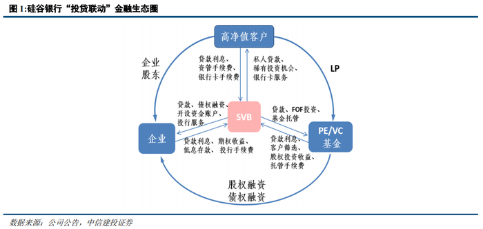 在分析本次风险事件之前,我们先对硅谷银行基本情况进行简单介绍:硅谷银行聚焦高科技高成长企业为主的对公业务,通过搭建投贷联动的金融生态圈,实现与科创企业客户和PE/VC基金的长期利益绑定和互赢发展。硅谷银行主要为科创企业提供贷款、债券融资等一系列综合金融服务,并以此获得科创企业客户的大量低息或无息存款。同时为PE/VC基金提供贷款、FOF投资等服务,并利用其尽调和投资结果来筛选企业发放贷款。
