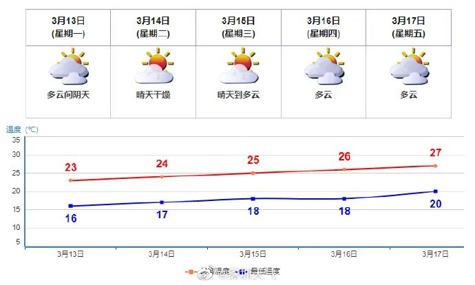 12日夜间至13日,受北方中等强度冷空气影响,我市阴天间多云,偶有零星小雨,北风逐渐加大,沿海高地最大阵风7级,气温16-22℃,体感清凉,周一午后风力减弱;