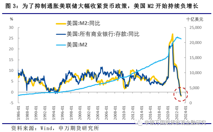但是大规模印钱的负面结果是通胀高企,为了抑制通胀2022年美联储采取了过去多年都没有过的速度提高利率水平。这样美国整体的流动性从极度宽松变为极度收紧。2022年下半年之后美国广义货币M2开始持续负增长,历史罕见。M2的构成主要就是银行的存款,对比银行存款的增速与M2的增速可以发现二者走势高度一致。M2的负增长也意味着银行存款的负增长。作为银行负债最重要的来源,存款负增长表明美国的银行业在经历了飞速的扩张之后,从2022年下半年开始资产和负债扩张的速度放缓。