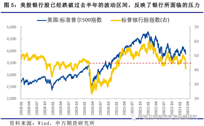 美国银行业面临的困境之二,是在资产负债表大幅扩张阶段购买了低利率资产,但是在存款负增长之后整体利率大幅上升意味着投资面临“浮亏”。从会计准则来看,债券放在持有到期账户意味着“浮亏”并不会体现在财务报表上。但是当银行的负债端变得不再稳定,甚至部分银行的负债开始减少的时候,那么其资产端的流动性就成为关键。如果流动性资产不足,银行就可能被迫卖掉原本放在持有到期账户中的债券,这样“浮亏”就变成实际的亏损。整个银行业的存款负增长,或表明从行业层面来看,银行的业绩可能面临一定的向下“调整”的压力。SVB的倒闭,显然已经触发了市场对这个问题的关注。美国银行股也连续2天出现较大幅度的下跌,跌破了过去半年的波动区间。SVB也表明,银行遇到流动性的问题可以很快转化为盈利问题,然后进一步转化为银行自身的生存问题。预计负债端较为脆弱的银行将成为市场关注的焦点。需要密切关注美国监管机构可能采取的行动。