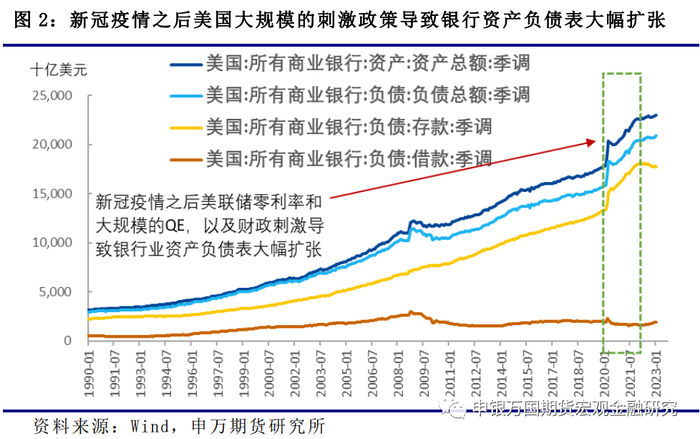 SVB的倒闭,有其自身经营相对独特的地方,但也反映了目前美国银行业所面临的困境。从2020年到2022年SVB的资产规模增加了一倍,这其实与美国整体的大环境有关。为了应对新冠疫情,美联储把基准利率降到零,并且采取无限量QE的政策大幅扩表。美国财政部也采取了多轮的财政刺激措施,这样带来的结果是美国的企业和居民普遍“不差钱”,银行账户的存款比疫情前增加很多,简而言之就是大规模“印钱”。居民和企业的存款就是银行的负债,存款的大幅上升就对应银行资产负债表快速扩张。从2020年初到2022年上半年,美国银行业的资产和负债扩张速度明显高于疫情前的水平。