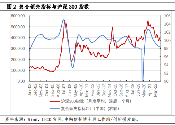 图2展示了中国的复合领先指标(CLI)与沪深300指数在2002年至2023年间的变化,可以看到,CLI的拐点往往领先股票指数的拐点1~2个月,CLI快速下滑时,股市很快也会发生大幅调整。与此同时,二者虽然在变化上呈现高同步,但两个指数本身并不一致,很难用CLI本身去估计股票市场的水平,复合领先指标(CLI)更多是作为择时信号,投资者更应关注CLI的一阶变化率。