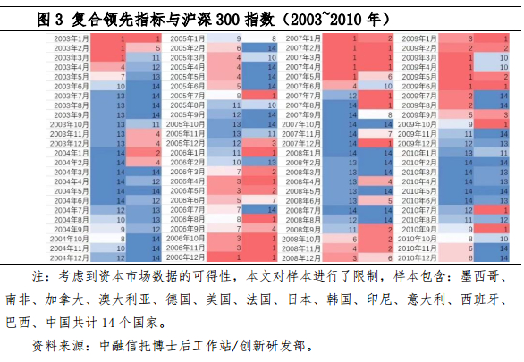 如图3所示,在整个2003年1月至2010年12月的样本期内,中国CLI的变化都很好地指示了沪深300指数代表的A股在国际主要资本市场中的排名情况。