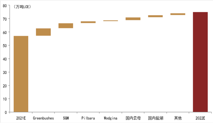 2022年锂资源供给增量以成熟项目的扩产为主。在近两年的锂价上涨周期中,锂资源供给增量的结构也在逐步演变,2021年的供给增量以在产项目产能利用率的提升为主,此时企业观察到锂价上涨增加资本开支,推进在建产能的开发进度,但尚未转化为产能增长,普遍提升产能利用率以响应需求增长。2022年的供给增量以成熟项目的扩产为主,成熟锂资源项目的产能扩张相对更具有确定性和灵活性,前期的资本开支投入逐步转化为产能增长,但是由于绿地锂资源项目需要更长的开发周期,贡献的产能增量有限。我们对2022年的供给增量进行拆分,新增供给主要自全球三个主要的成熟锂资源,包括Greenbushes锂矿的CGP3项目和TRP项目、Pilbara锂矿的P680项目、SQM旗下Atacama盐湖的产能扩张。