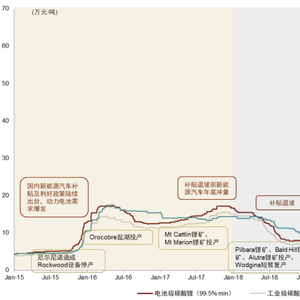 ►第一轮周期的上涨阶段(2015-2018年):涨价初期,2015年开始国内新能源汽车鼓励政策密集出台,驱动动力电池对锂需求的大幅增长,同时厄尔尼诺现象造成南美盐湖锂盐减产和运输受阻,对锂盐供给形成一定扰动,锂价从2015年初至2016年4月从4.3万元/吨上涨至突破新高的17.3万元/吨,后续随着供给恢复锂价短暂回调。涨价后期,2017年补贴退坡前新能源汽车年底冲量,需求端中游企业补库需求增加,在供给侧新增产能逐步投产但尚未形成大规模供给,澳洲的Mt Cattlin锂矿、Mt Marion锂矿在年内相继投产,锂价从2017年初的12.6万元/吨上涨至12月的高点17.2万元/吨。