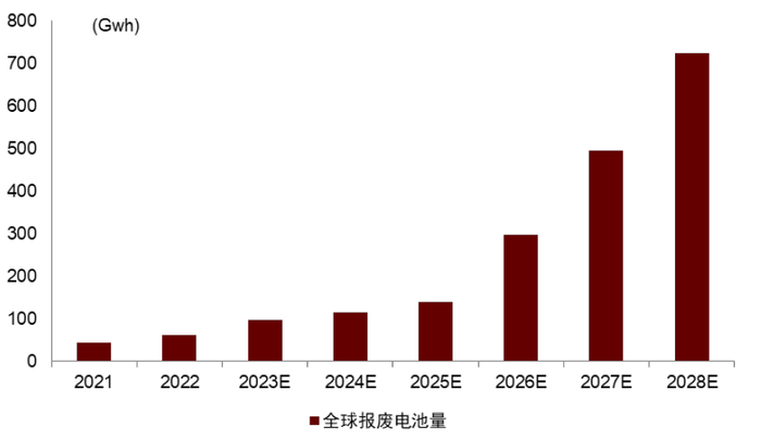 图表36:2021-2030年全球报废电池量预测