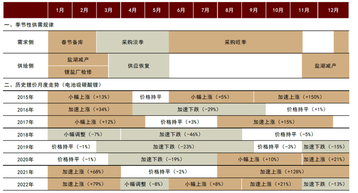 图表4:锂价的季节性供需规律及历史价格走势