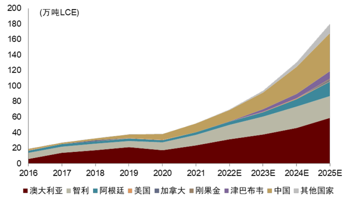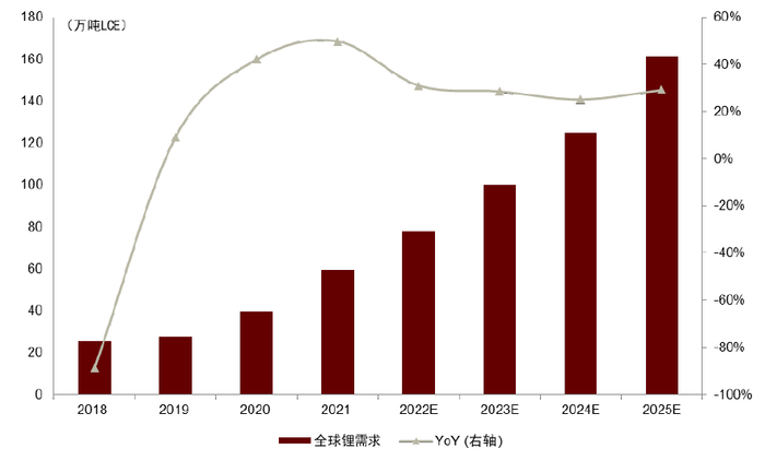 图表16:2018-2025年全球锂需求及预测