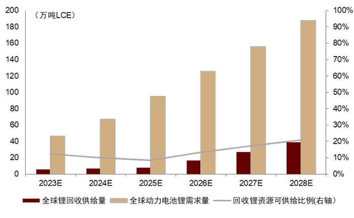 三是锂资源回收将带来锂供给侧的下一次重构。当前锂资源供给以锂矿开采贡献的“一次供给”为主,通过报废电池的回收,以电池回收料为来源的“二次供给”有望带来全球锂供给的重构,一方面,相比于锂资源的开发,电池回收的供给具有更强的稳定性和灵活性,另一方面,区别于锂资源的地区分布不均、资源产出区域和需求区域错配的格局,电池的供给将锂资源根据消费市场进行地域的再分配。我们预计2023年全球的报废动力电池量约97Gwh,至2028年将增长至725Gwh,2023-2028年CAGR高达50%,以此为基础,我们预计2023年全球来自报废电池回收的锂资源供给量约5.6万吨LCE,可供给约12%的动力电池锂需求,至2028年将增长至39.0万吨LCE,可供给约21%的动力电池锂需求。