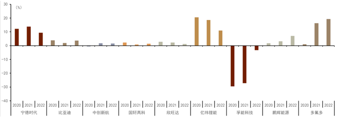 图表11:2020-2022年主要电池企业归母净利润率情况