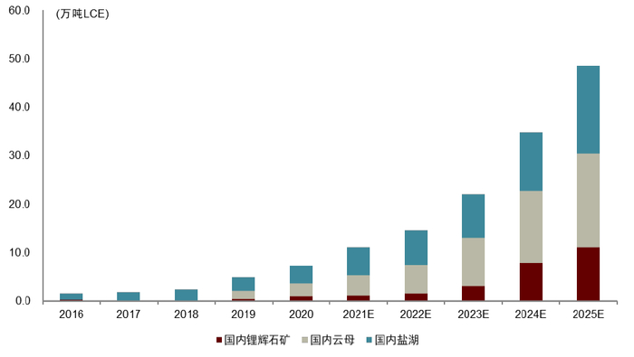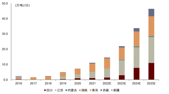 图表30:2016-2025年国内分区域锂资源供给结构预测