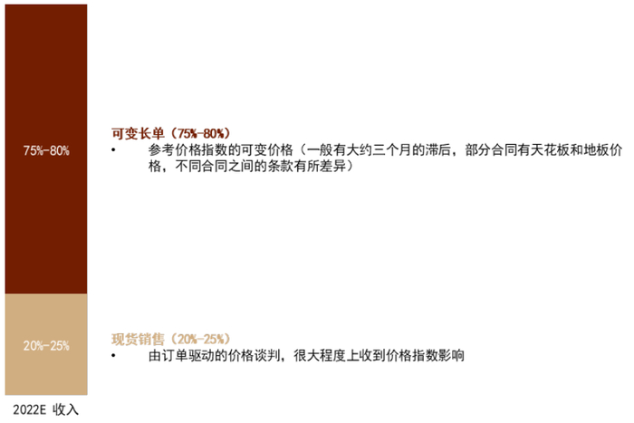 从主要企业看,雅保方面,公司在2021年的电池级锂盐销售中大部分被可变长单锁定,2023年开始雅保将原来的锁价长单大规模重修为与可变价格长单,其中相对现价普遍滞后3个月的可变长单占比达到75%-80%,以采购时现货价销售的短单占比约20%-25%。SQM方面,根据公司的公开电话会议披露,2021年上半年公司有超过75%的合同是锁定价格的,但是2021年下半年开始这些合同将逐步到期,公司预计2023年的锂盐销售合同将100%与市场价格指数挂钩。Allkem方面,2021年公司碳酸锂的销售合同约三分之二的产量以年度价格计算,约三分之一的产量与现货价格挂钩,2022年公司重新谈判销售合同后逐步减少固定价格合同和价格天花板的设定。