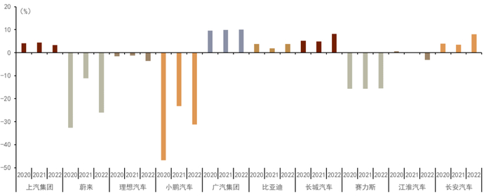 图表12:2020-2022年主要新能源汽车企业归母净利润率情况