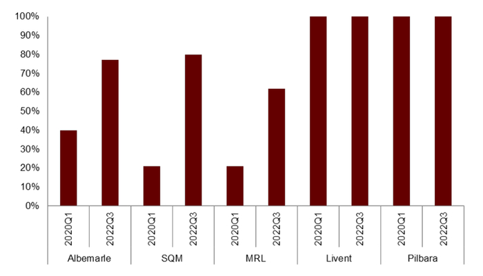 一是定价机制,海外锂业龙头大规模重修锂盐销售合同,实际销售价格更加贴近现货价格。从2022年开始,海外锂业龙头均在逐步调整销售合同的长单和短单结构,将原来大部分的固定价格长单调整为与现货价格相关的可变价格长单,实际销售价格更加贴近现货价格。