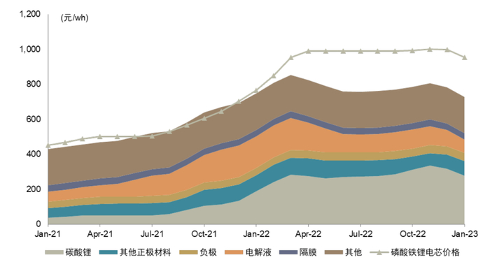 从需求端看,锂价上涨已经引起需求端的反噬。正极材料是锂电池成本占比最大的部分,其生产成本主要受到锂盐价格影响,根据我们测算,以2022年11月锂价高点的铁锂正极均价计算,正极约占电池成本的51%,锂盐约占正极成本的82%。因此锂盐价格的大幅上涨带来电池成本上升,来自上游的成本压力在产业链下游逐级传导。这导致三个主要的结果,一是部分电池厂和新能源车企的盈利能力较弱,部分议价能力偏弱的电池厂难以将成本压力充分传导至下游,而电池的涨价导致新能源车企的盈利能力偏弱,以新能源汽车销售为主的企业归母净利润多为亏损状态,盈利能力降低或带来下游产能出清的潜在风险。