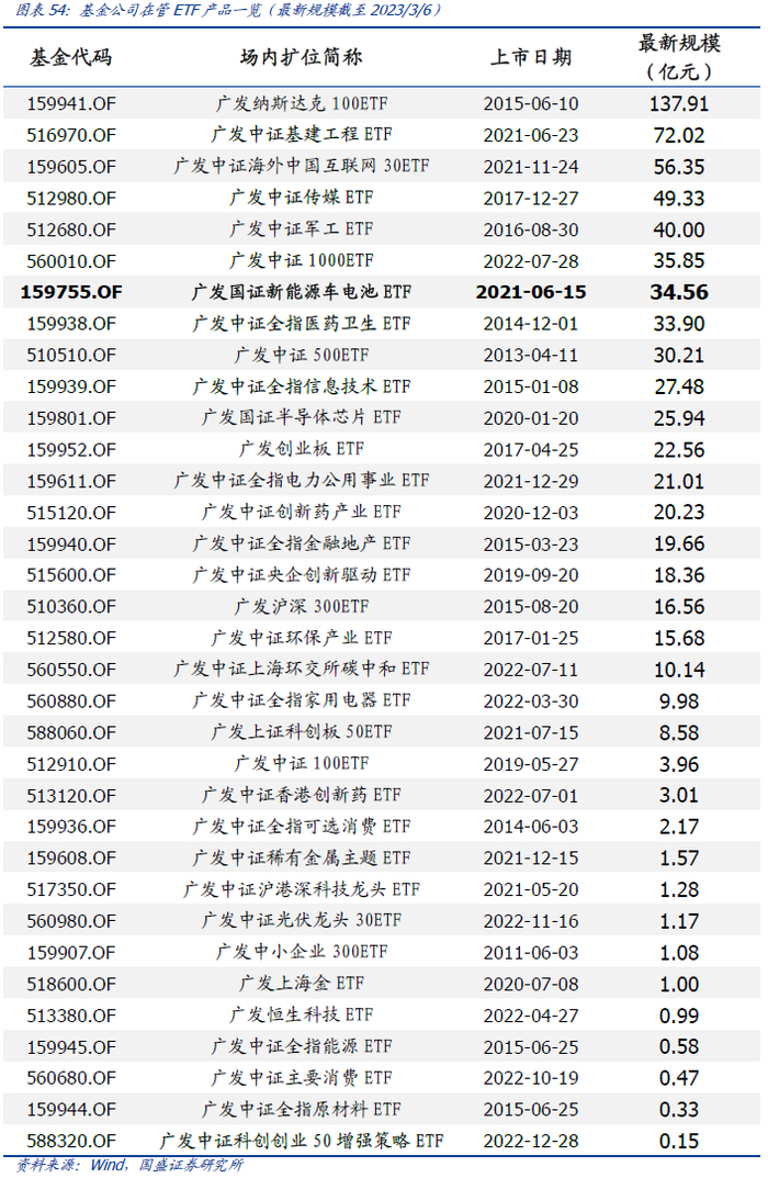 管理人具有丰富的ETF产品管理经验。基金管理人为广发基金管理有限公司,截至2023年3月6日,广发基金管理有限公司共管理ETF基金34只(不含ETF联接基金),ETF规模合计已达约724亿元,产品涵盖了宽基、行业、主题等多个类别,为投资者提供了全方位的指数投资工具,基金公司旗下ETF产品线齐全,管理经验丰富。