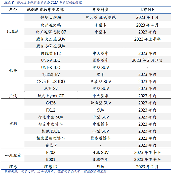 2023年新势力车型矩阵逐步完善,自主车企加快新能源车型投放。从具体车型规划来看,理想等造车新势力规划的车型矩阵正逐步完善。比亚迪、吉利、长安等自主车企将基于自主研发的纯电与混动技术平台加速投放新能源汽车车车型,以长安汽车为例,将基于其iDD插电混动技术平台以及EPA纯电技术平台推出包括深蓝S7、C236、览拓者EV、阿维塔E12等重磅产品。我们认为2023年将成为新能源汽车产品大年,中国新能源汽车市场供给丰富度将进一步提升。