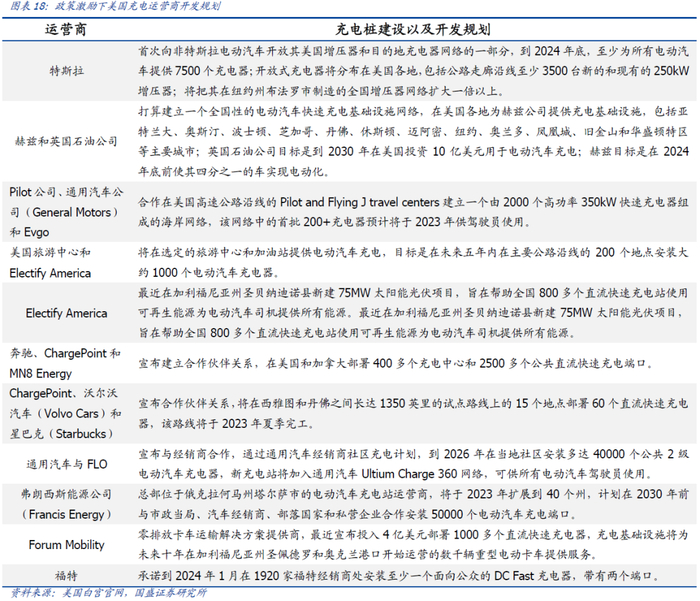 多家充电运营商积极响应,加快充电网络建设规划。随着新政策的推出,特斯拉、BP等多家充电运营商积极响应,提出未来两年加快沿海电动汽车充电网络,其中特斯拉宣布将首次向非特斯拉电动汽车开放其部分美国充电网络,并到2024年底向非特斯拉客户至少开放7500座充电桩,其中包括高速公路沿线走廊的3500个新建和现有的250KW充电桩。