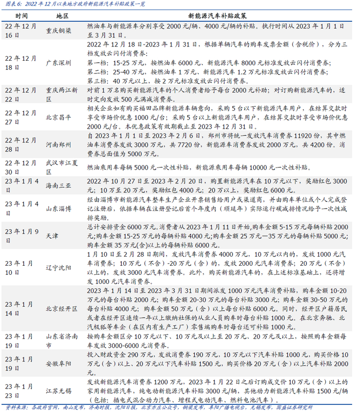 地方政府补贴陆续推出,刺激新能源汽车消费。自2022年底开始,北京、重庆、三亚等地区地方政府开始推出新能源汽车购置补贴政策,如河南郑州采用汽车消费券形式,自2023年1月1日至2023年2月6日,全市统一发放利润汽车消费券11920份,其中新能源车消费券发放2000万元,共4200份,燃油车消费券发放3000万元,共7720份。消费券总面值为5000万元。
