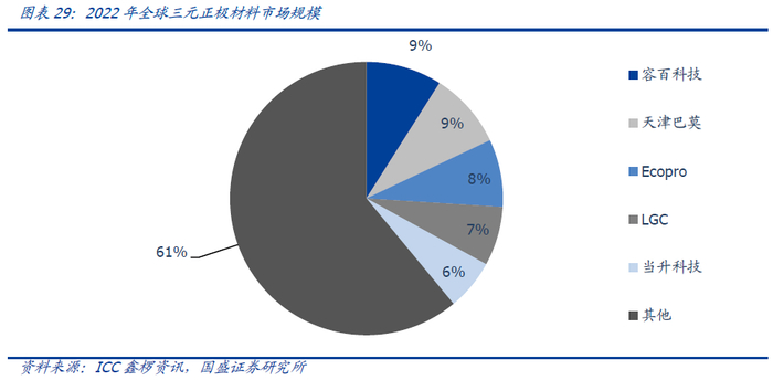 2、中国动力电池全球市占率领先全球,材料厂商具备先发优势。在2010-2022年国内政策支持以及产业链技术积累的前提下,国内电池和主材环节占全球份额较高,中国新能源汽车动力电池行业在全球的先发优势逐步显著。远期来看,中国动力电池产业链有望随着全球电动化加快走向世界,成就国际龙头地位。