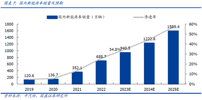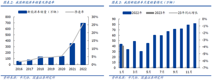 2022年国内新能源汽车销量维持快速增长,渗透率超25%。根据中汽协数据,2016-2022年,中国新能源汽车销量由51.7万辆提升至688.7万辆,对应CAGR为53.97%。2022年同比增长96.38%,渗透率25.6%。分月度来看,2022年12月销量达81.4万辆,创历史新高,同比增长51.8%。23年1月销量达40.8万辆,同比下降6.3%,主要由于(1)2023年起,新能源汽车购置补贴政策终止;(2)今年除夕为1月21日,为近十年来最早的一次中国春节。