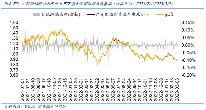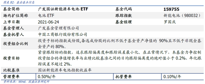广发国证新能源车电池ETF基金(简称:电池ETF,代码:159755),标的指数为新能电池指数(代码: 980032)。基金成立于2021年6月15日,于2021年6月24日上市交易,基金投资目标是紧密跟踪标的指数,追求跟踪偏离度和跟踪误差最小化。在正常情况下,本基金力争控制投资组合的净值增长率与业绩比较基准之间的日均跟踪偏离度的绝对值小于0.2%,年化跟踪误差不超过2%。