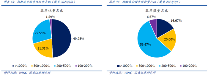 新能电池指数成分股偏向中大市值风格。截至2023年3月6日,指数的30只成分股总市值超过3万亿元,自由流通市值合计约1.63万亿元。从具体成分股的市值分布来看,成分股总市值均超过100亿,其中总市值大于1000亿的成分股累计权重占比、数量占比分别为49.25%、16.67%。仅2只成分股总市值小于200亿元,权重占比仅为1.89%。因此新能电池指数成分股在市值风格上整体偏向大市值。