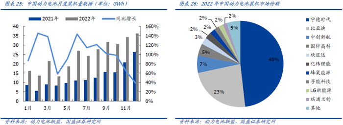 国内动力电池装机量增速迅猛,宁德时代、比亚迪龙头地位稳固。2022年全年,国内动力电池累积装车量294.6GWh,同比增长90.7%。从格局角度来看,宁德时代份额稳定在48%,比亚迪受益于下游车型销量大幅提升,占比由2021年的16.2%提升7.3pct至23.5%。整体来看,2022年1-12月,国内动力电池装机量CR3、CR5分别为78%与85%,相较于2021年的74%与83%均有提升,强者恒强趋势显现。二线厂商格局相比2021年变化明显,内资品牌欣旺达、亿纬锂能、蜂巢实现对外资厂商LG的超越,国产动力电池厂商竞争力凸显。