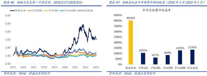 新能电池指数长期表现优异,弹性较高。截至2023年3月6日,新能电池指数自2015年发布以来区间累计收益率高达201.23%,大幅跑赢沪深300(16.66%)、中证500(8.19%)、中证1000(-0.33%)、创业板指(28.36%)等宽基指数。计算万得全A指数的月度收益率,如果万得全A指数月度收益率大于过去3年的月度收益率均值,则定义为权益牛市情景。自2015年3月以来,96个月份中有44个月份划分为权益牛市情景,指数在这44个权益牛市月份中的累计收益率高达4014%,大幅高于其他宽基指数。因此,长期来看新能电池指数表现优异,弹性较高,具备相对优势。
