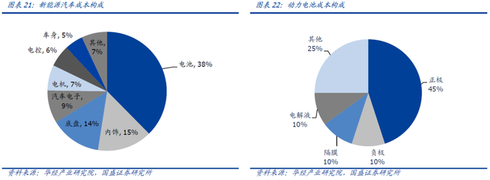 动力电池为新能源汽车核心部件,正极、负极、电解液、隔膜为四大主材。从新能源汽车的成本结构来看,由动力电池、电机、电控组成的新能源汽车电动动力总成系统占新能源汽车整体成本的比重达51%,其中动力电池决定新能源汽车续航历程以及动力性能表现,为新能源汽车核心零部件,成本占比达38%。从动力电池的成本构成来看,正极材料、负极材料、电解液、隔膜材料等决定动力电池产品倍率与安全性能的重要材料为动力电池成本主要来源,对应成本占比分别为45%、10%、10%、10%。