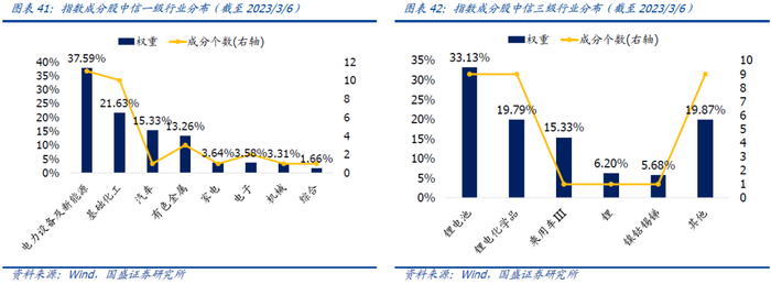 指数成分股行业集中度较高,聚焦于锂电池、锂电化学品、乘用车等行业。从指数成分股的中信一级行业权重分布来看,指数共涉及8个中信一级行业,电力设备及新能源、基础化工、汽车这三大行业权重占比最大,占比分别为37.59%、21.63%、15.33%。从更加细分的中信三级行业分布来看,指数成分股聚焦锂电池、锂电化学品、乘用车等行业,这三大细分子行业累计权重占比达到68.25%,行业集中度较高。