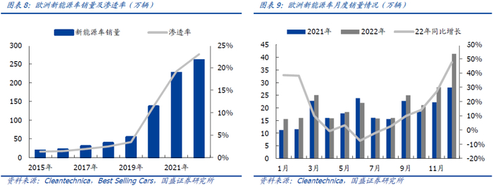 2023年欧洲需求复苏可期。在俄乌冲突影响的减小下,预计今年新能源车将得到复苏,预计销量在309万辆,同比增长19%,渗透率达27.4%。