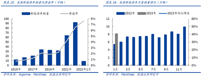 2023年1月,美国新能源车销量达8.1万辆,同比增长51.2%。2016-2022年,美国新能源汽车对由16.0万辆提升至91.5万辆,对应CAGR为33.72%。2022年,美国新能源车销量同比增长41.6%。此外在2023年1月,美国新能源车销量达8.1万辆,同比增长51.2%,渗透率为7.6%,与欧洲和中国相比,美国仍有较大的提升空间。