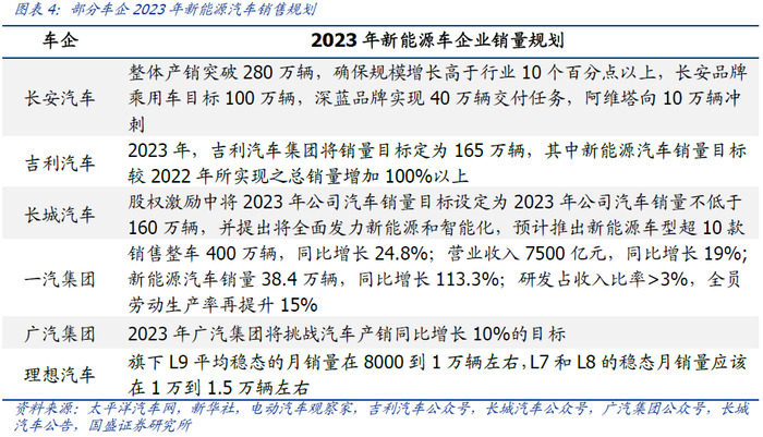 2023年国内车企新能源汽车规划销量维持高增速目标。2023年1月以来,国内主要新能源汽车厂商陆续发布2023年销量规划。从目前部分车企发布的2023年汽车销量规划来看,新能源汽车销售规划维持高增速目标,吉利、一汽集团等车企均设定了超100%以上的新能源汽车销量目标增速。长安旗下新能源品牌深蓝以及阿维塔合计销量目标为50万辆,长城汽车则预计推出超10款新能源车型,2023年行业仍然保持高增速预期。