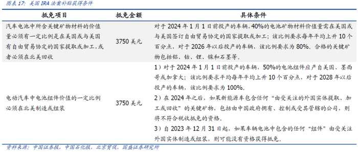 美国通过IRA法案,取消20万辆补贴的上限限制并推出7500美元补贴。2022年8月,美国总统拜登正式签署了《通货膨胀削减法案》(Inflation Reduction Act,简称IRA法案),并于9月正式生效。其与新能源车相关的主要是取消了此前对汽车制造商20万辆补贴的上限限制,并提供了每辆车最高达7500美元的税收抵免。其中,20万辆限制的取消将利于特斯拉在内的车企,使其再次进入补贴行列。而7500美元的补贴则分成2部分,即分别对电池关键原料及电池部分做出了来源地或组装地的限制。