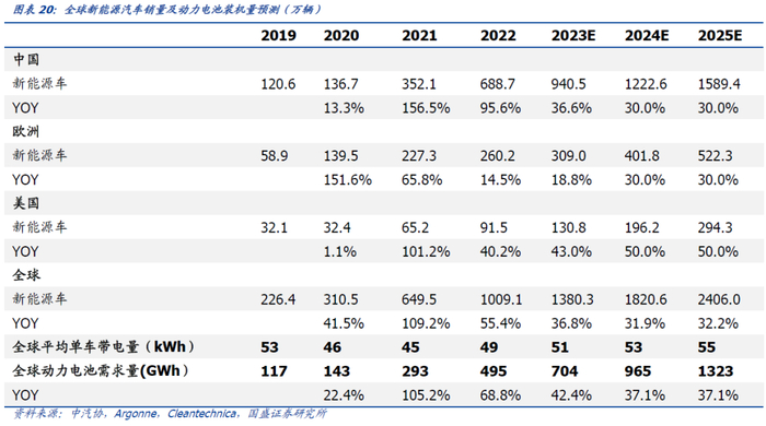 1、中国供需双侧驱动,欧美迈入强政策驱动阶段,全球新能源汽车景气度持续。目前中国、美国、欧洲等全球新能源汽车行业所处的产业生命周期阶段来看,中国市场已经进入优质供给与消费认知驱动的成长期,优质供给将驱动新能源汽车销量持续提升;而美国与欧洲市场未来几年将迎来政策强驱动时期,随着各国政府补贴与激励政策的落地,将推动美国、欧洲市场优质供给增加与居民消费认知升级,未来几年全球新能源汽车行业将持续高景气度。预计2023-2025年全球新能源车销量为1380/1821/2406万辆,同比增长36.8%/31.9%/32.2%。假设2023-2025年单车带电量为51/53/55kWh,则对应全球动力电池需求量为704/965/1323GWh。
