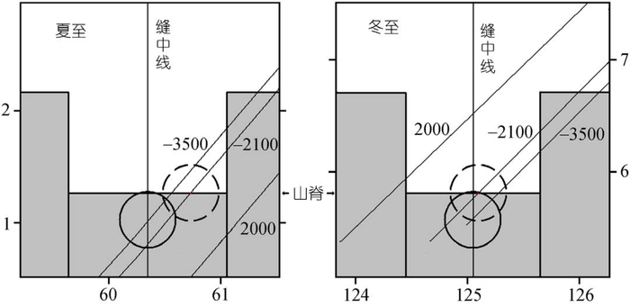 武家壁等[1]天文考古专家尝试模拟公元前2100年时在陶寺观象台的观测情况,结果显示在夏至日,当太阳在远处山脊露出一半的圆面时,从观测点望去,太阳位于最北侧的狭缝内右部;而在冬至日,当太阳同样露出一半的圆面时,会正好出现在由北至南第11条狭缝的中央。太阳永远不会从最南侧的狭缝升起,该缝在冬至日狭缝以南6度,有学者推测这可能标记了月球在升起时能到达的最南点。