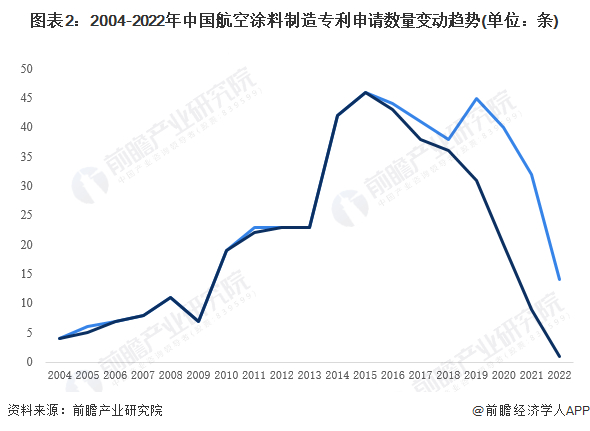 根据国家知识产权局专利统计,2004-2015年中国航空涂料制造领域专利申请及授权数量整体呈现上涨趋势,其中2015年全年航空涂料专利申请量和授权量均达到46项。自2015年起,中国航空涂料制造专利数量逐步下降,反映自2015年航空涂料在技术领域发展热度逐步回落。