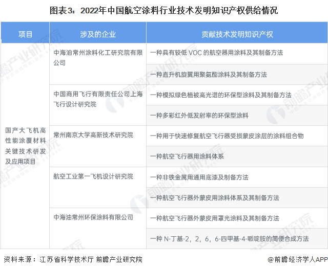 江苏省科学技术厅与2022年7月公示的2022年度江苏省科学技术奖形式审查结果显示,中海油常州涂料化工研究院有限公司、中国商用飞行有限责任公司上海飞行设计研究院、常州南京大学高新技术研究院、航空工业第一飞机设计研究院、中海油常州环保涂料有限公司联合完成的“国产大飞机高性能涂覆材料关键技术研发及应用”项目入围。该项目的入围在2022年为航空涂料在技术领域的供给又增添一批新的技术发明知识产权,为行业发展推进做出贡献。