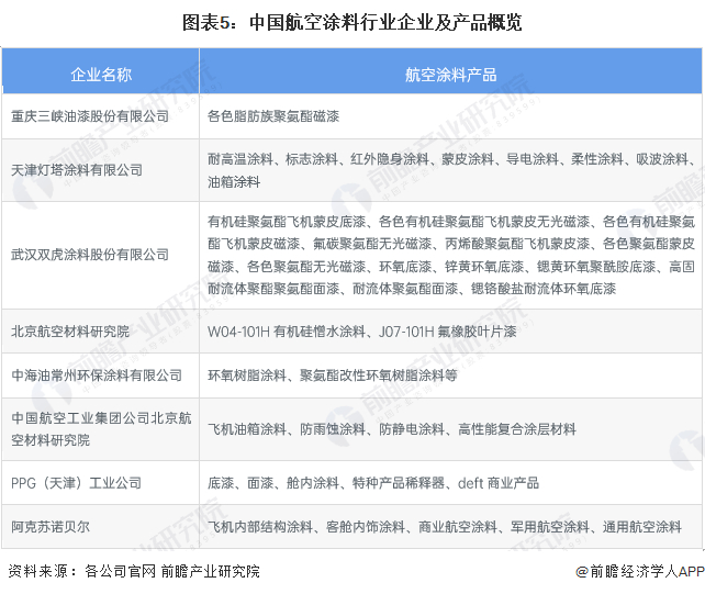 当前航空涂料供给商有重庆三峡油漆股份有限公司、天津灯塔涂料有限公司、武汉双虎涂料股份有限公司从原材料类型分,产品覆盖环氧树脂涂料、聚氨酯涂料、丙烯酸涂料等。从用途分产品覆盖高温涂料、标志涂料、红外隐身涂料、蒙皮涂料、导电涂料、临时涂料等。