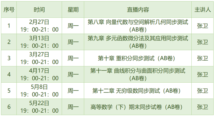 中国教育新闻网讯(记者 焦小新)高等教育出版社的“高等数学伴学计划”将设置习题课、同步试卷精讲、期末专项辅导三个板块,增添更多内容,涵盖了高数(下)、线性代数、概率论与数理统计等模块。从开学到期末,帮助大家逐一击破重难点。