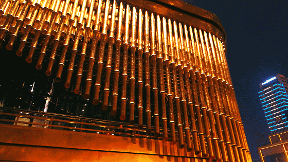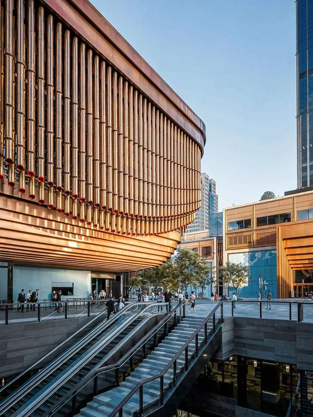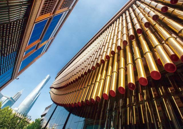 这栋地上四层地下三层的独立建筑,由英国建筑设计事务所 Foster + Partners和英国当代最具创意的奇才,建筑界的达·芬奇,托马斯·赫斯维克联合设计而成。整个建筑最大的特色就是融汇了中西特色的三层金色可转动幕帘,极具辨识度。