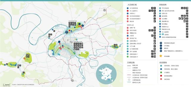 在奥运村10公里范围内,在巴黎中心区和大巴黎都市区两个范围内巧妙设置大量竞赛和非竞赛场馆。巴黎中心区作为大都市核心地带,在塞纳河沿岸布局十余个比赛场地,展现文化魅力;大巴黎都市区主要围绕圣但尼运河轴线,通过协调地区发展计划与社区需求,建设了6个比赛场馆,以及运动员村和媒体村、主媒体中心和奥林匹克体育场。塞纳河在其中发挥着核心作用,既联系着紧凑布局的场馆,又将这座城市的历史中心与新兴的大巴黎地区结合在一起。