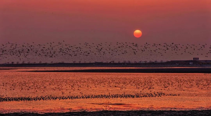 丹东(东港)鸭绿江口国家湿地观鸟园:中国第二大湿地,候鸟栖息时形成鸟浪。