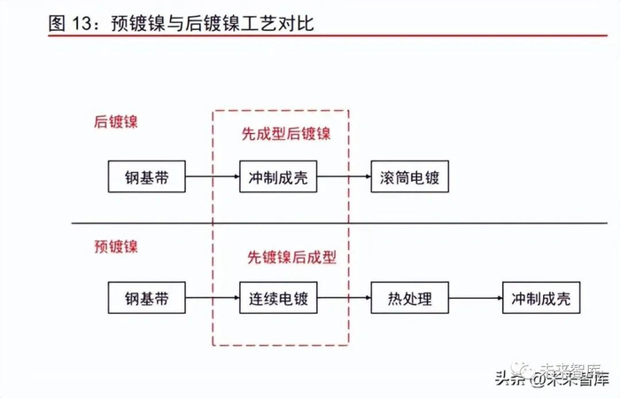 电池的钢壳需要进行镀镍处理,预镀镍比后镀镍镀层更均匀,电池一致性更好。为了 防止电池正极活性材料对钢壳氧化,需要对钢壳进行镀镍处理,增强耐腐蚀性。镀镍处理 有两种方式,预镀镍和后镀镍。顾名思义,预镀镍指先在钢材上镀镍,再用镀镍钢材加工 成壳体;后镀镍指先将钢材冲压成壳,再将壳体通过滚筒镀镍。预镀镍是在形状简单的钢 材上镀镍,因此预镀镍的镀层厚度更均匀;此外,由于后镀镍采用的是滚镀镍工艺,镀层 表面容易有划痕、镍粉脱落,容易造成电池内部微短路。因此预镀镍工艺下电池的一致性 更好。