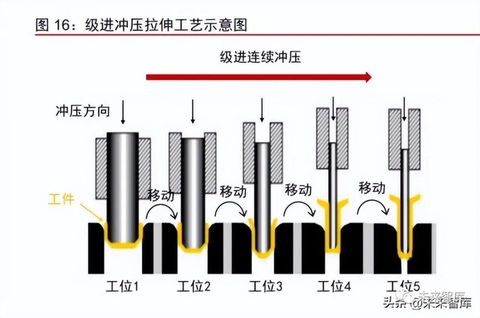 DWI 新型工艺本质上也是一种冲压拉伸工艺,在大圆柱电池上有应用潜力。当前的电 池壳体生产采用级进连续冲压,被加工工件在各个工位上逐次冲压后转移至下一工位,一 级一级加工至最终形状。DWI 工艺本质上也是一种冲压拉伸工艺,区别在于被加工工件在 同一工位上,连续通过不同内径的模具,一次冲压成形。DWI 工艺目前应用于铝制易拉罐 的大规模生产上,未来有望在大圆柱电池上有应用潜力。