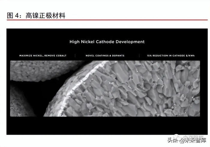 除尺寸上的变化外,4680 电池搭载众多“黑科技”,具备高能量密度、高充放电功率 的同时,单 kWh 成本下降 56%:黑科技一:高镍正极+硅负极,提升能量密度。在 2020 年电池日活动中,特斯拉介绍 了 4680 将采用高镍正极和硅负极材料。正极材料上,镍含量提升一方面能够增加电池的 能量密度,另一方面相对价格昂贵的钴含量降低,正极材料的成本亦降低;负极材料上, 硅拥有比现有石墨体系更高的克容量,高克容量负极可以提高电池的能量密度。
