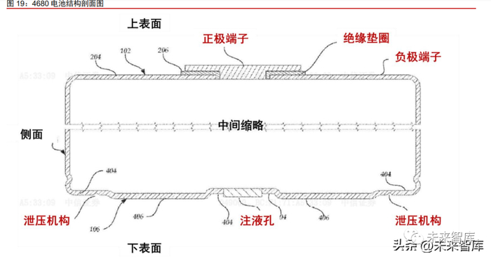 4680 电池采用热电分离设计,正、负极端子位于电池上表面,泄压阀、注液孔位于 电池下表面。根据特斯拉 4680 电池的专利文件,4680 电池的上表面包含正、负极端子, 两者由绝缘垫圈相隔,上表面尽可能平整,用于汇流排焊接;电池的下表面整合了所有非 平面、非端子功能,包括泄压阀、注液孔等结构。这种结构下,电气端子与泄压结构在空 间上分开,采用“热电分离”设计。