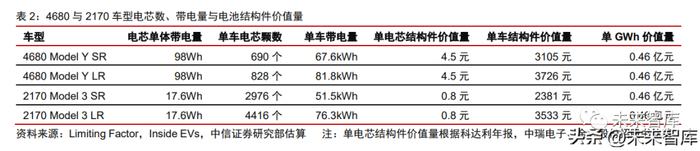 当前 4680 电池结构件相比 2170 电池结构件单 GWh 价值量基本持平。根据 Limiting Factor 的 4680 电池拆解和 Munro 的 4680 Model Y 拆解结果,当前 4680 电池的电芯单 体带电量为 98Wh,标续版本中电池包中电芯排列为 69×10=690 颗。当前 4680 结构件 单电芯价值量约为 4.5 元,对应单车电芯结构件价值量为 3105 元,折合 0.46 亿元/GWh, 与当前 2170 电池的单 GWh 价值量基本持平。随着 4680 规模上量以及电芯能量密度提升,预计未来 4680 结构件单 GWh 价值量将 有所下降。当前 4680 电池仍处于爬坡期,4680 结构件的生产规模较小,单价较高。我们 预计随着 4680 量产规模的提升,结构件的大批量采购价格将有所下降。另一方面,初代 4680 电池的电芯能量密度仅为 276Wh/kg,高镍正极、硅负极等技术暂未得到应用。随着 4680 自身的迭代升级,能量密度提升,预计单 GWh 结构件价值量将有所下降。